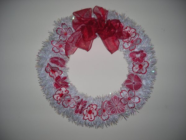 fillAs promised I am sharing my embroidered wreath. This is a very easy project. The hardest thing was wrapping the tinsel garland around the styro foam wreath.  Using my Futura Quintet and my new Singer Studio S10 I loaded several floral designs to embroider with red thread. I hooped 2 layers of sparkle organza and embroidered many of these flowers in my spare time. I cut each flower out and pinned it to the wreath.