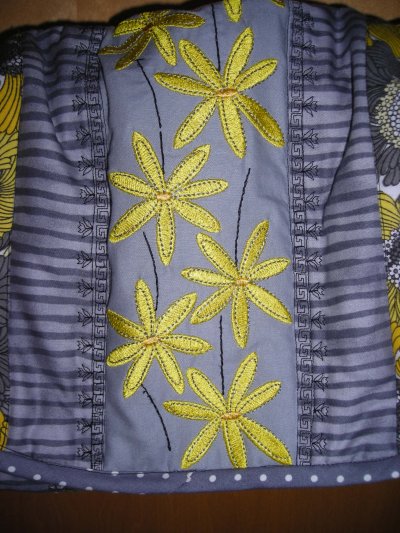 have been having fun with the endless hoop on the Futura Quintet. I thought the border designs would be great for my Strip pieced purse pattern. The Futura Quintet has a lot of the border designs built-in. As you can see by my sample I used the large floral pattern. The only problems I ran into was that the jump stitches were so long that the top thread would break between the branches. Advise is to slow the machine way down and turn off the cutter.