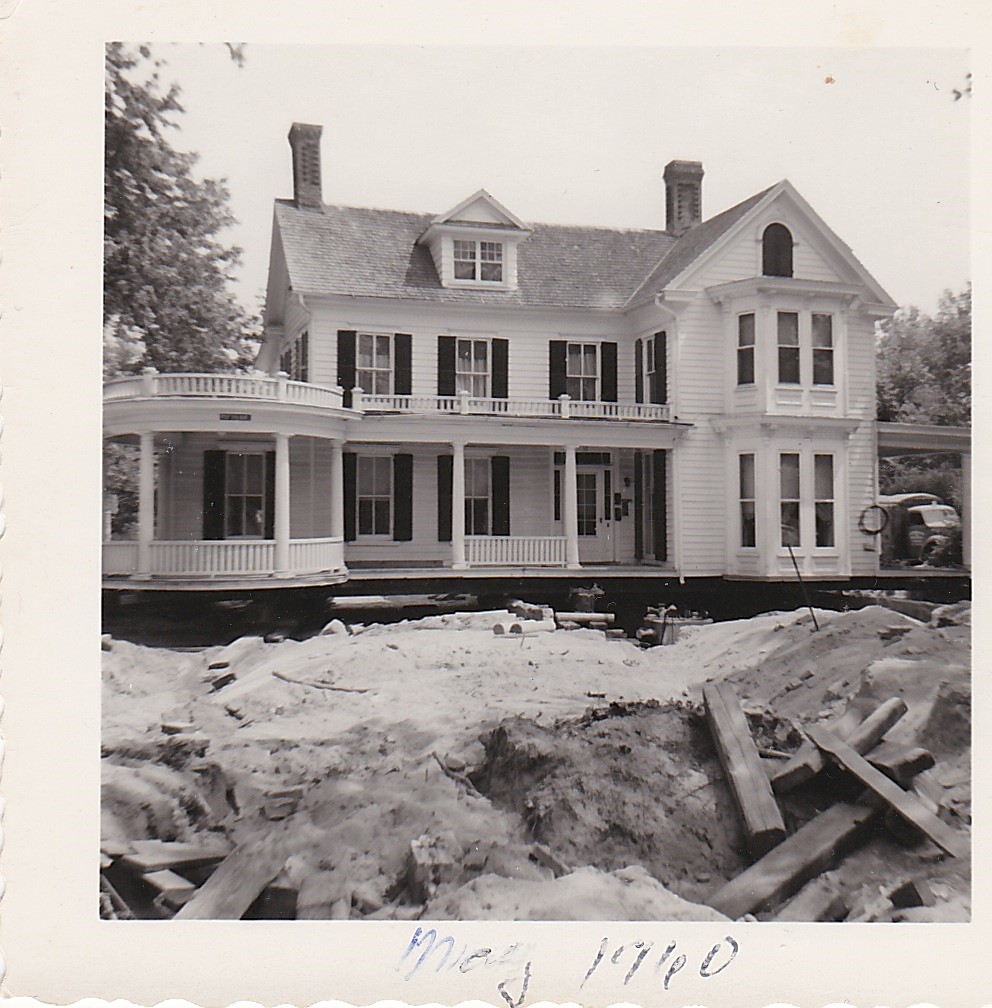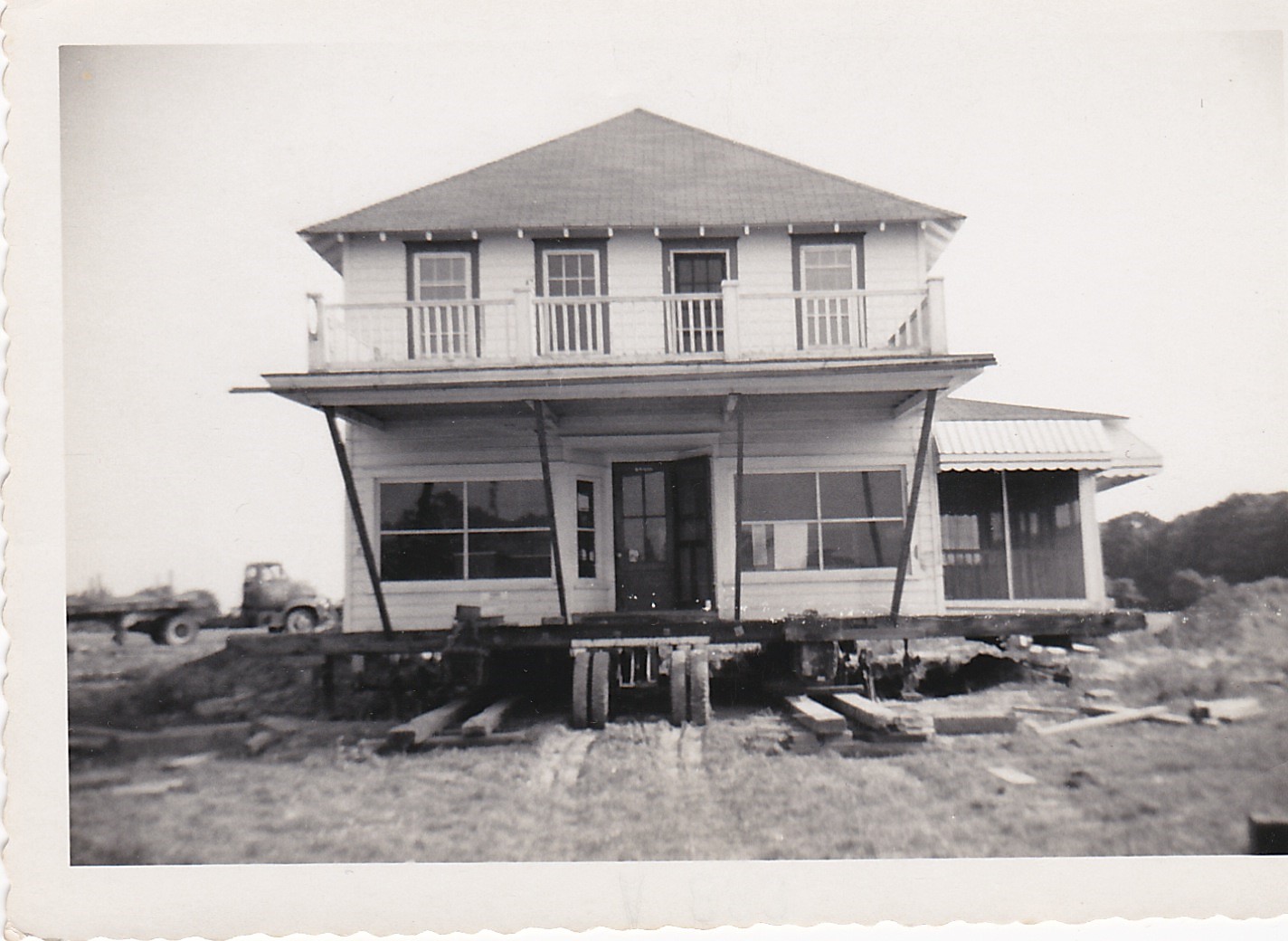 When I was little, my dad was in the house moving business with his dad. It was very dangerous work. Route 13 was expanding and some houses along the new road were moved to make room. I was too small to understand where or when but I do remember what my dad did. Recently I came across some pictures of the “jobs” as they were called and thought I would share some history with you. I know there is still house moving going on, they moved the Hatteras light house years ago. I remember after hurricane Hazel the phone rang and rang with people needing houses put back on foundations and trees being sawed and moved. I also saw them show how house moving was done on the history channel. I can not imagine seeing this done today. It was very specialized work and physics was a must. Here are some pictures to share of a tastee freez being moved, a ferry being moved, a large houses, being sawed in half and moved. The house had to fit on the street or go over a bridge as it was being moved and power and phone lines had to be pulled so the houses did not interfere, it was quite a feat. Most of these homes and businesses were large structures. Sometimes roofs came off before they were moved. My grandfather, James Edward Friedel and my dad C Gray Friedel did all this. Today we just tear it down and start again.