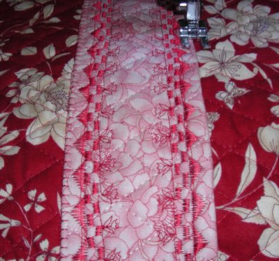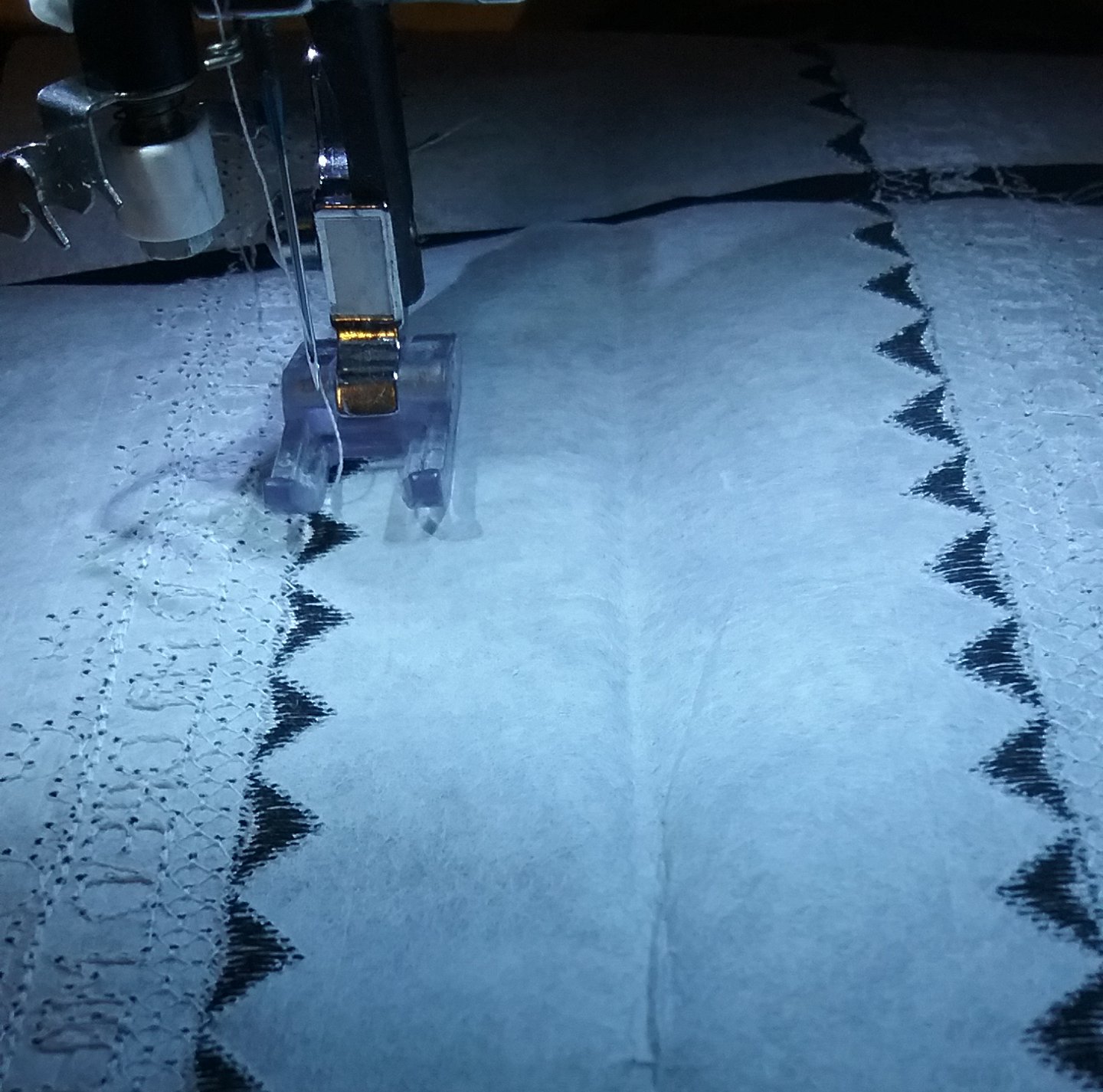 I used “Fuse N Tear” iron on stabilizer on the back side of the solid strip I am using to create the lettering and decorative stitches. I am also using “filtec” bobbin thread for a better decorative stitch tension and an “Open Toe” applique’ foot to help the fabric feed well and allow me to see where I am stitching.