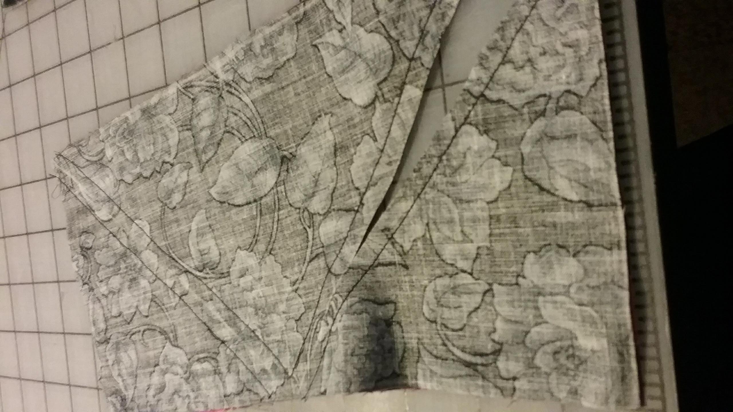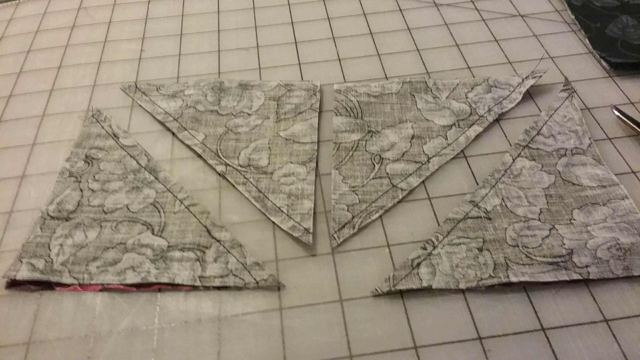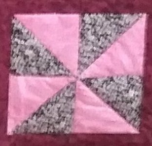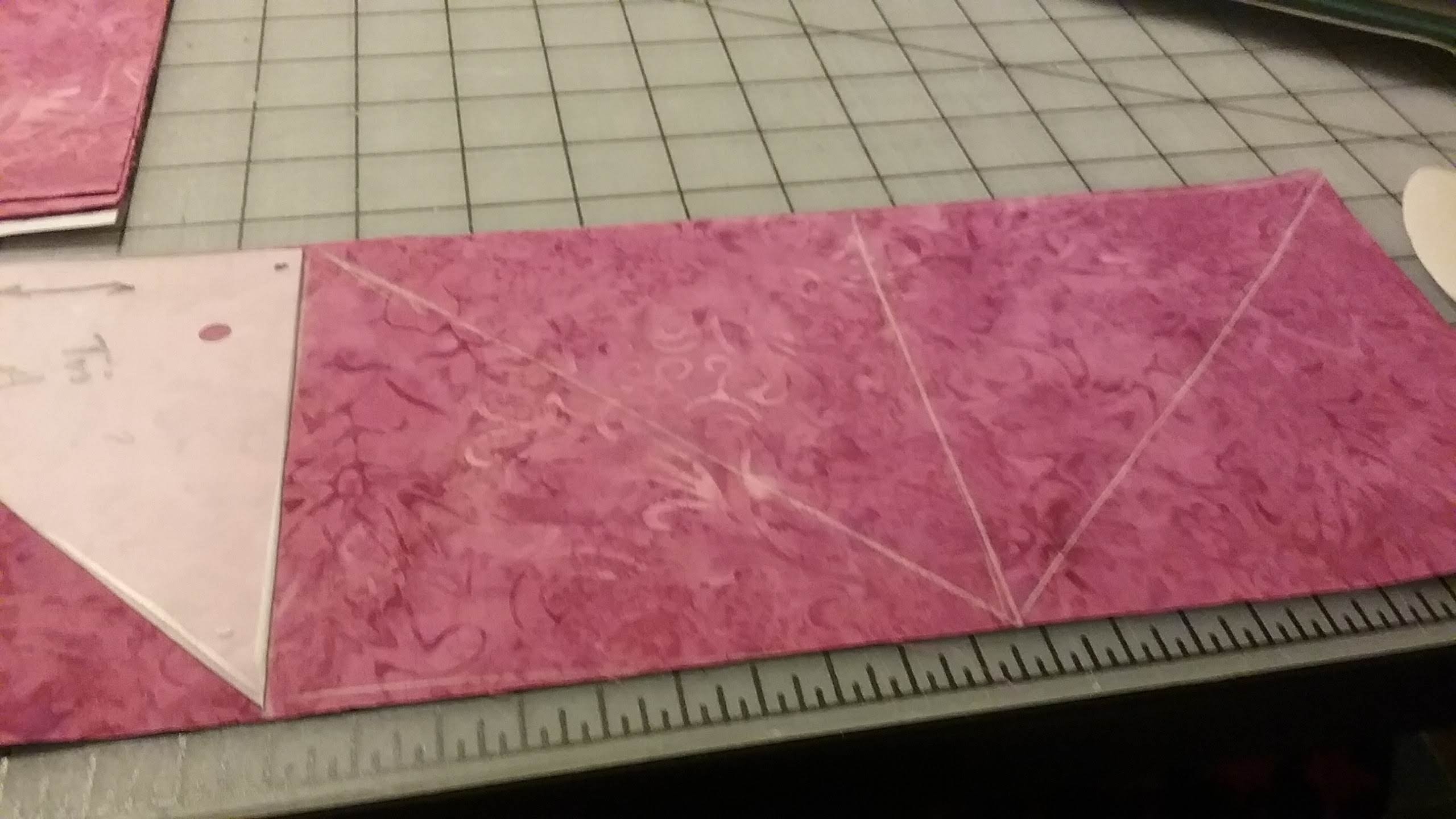 In our February meeting I demonstrated the pin wheel block construction and showed how to use the “E” template from the Lap Quilting book. Two fabrics were placed right sides together and the “E” template was used to determine the width of a cut strip across the 45″ width of fabric. I drew the “E” template on the strip back to back and showed how to sew the 1/4″ seams for easy and fast construction. Once I sewed the 1/4″ seams on both sides 45 degree line of the triangles drawn, I cut the pieced triangles apart. Janet demonstrated how the triangles are pressed. The seams are pressed in one direction to make piecing perfect. Diane had a flannel layout board and I used it to form the pinwheel block layout to make it easy to piece the block. I included pictures of all the techniques demonstrated.