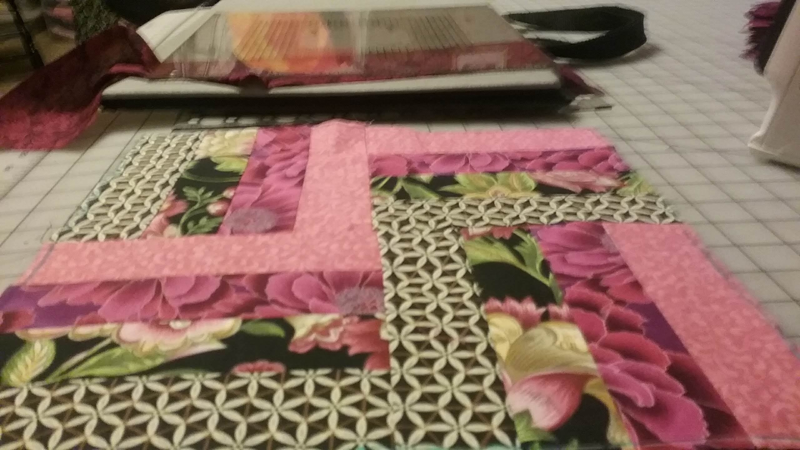 I showed how to use a rotary cutter and how I chose the strip size to cut using the Lap Quilt book. I pieced the rail fence strips together and pressed the seams to one side from the right side. Using the “A” square I drew the 6 1/2″ squares and cut them by hand. The layout was created and then the rail fence block was pieced using the 1/4″ foot.