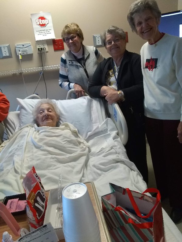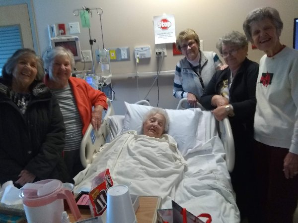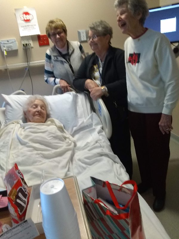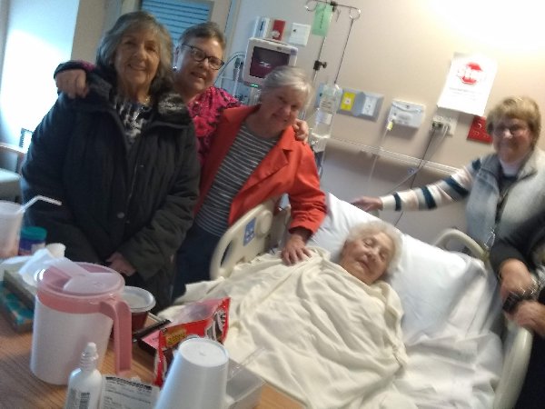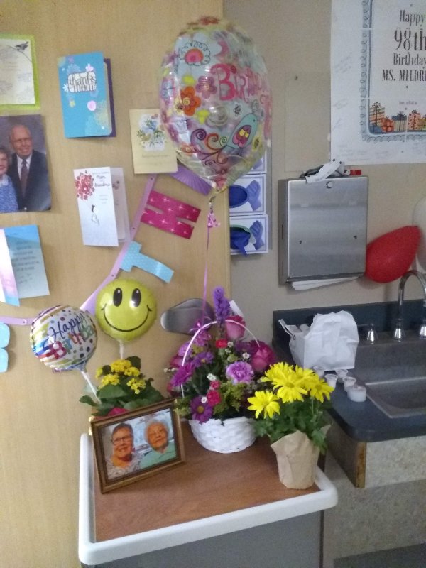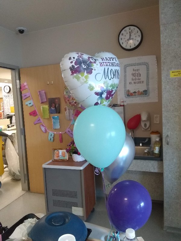 Mom had her 98th birthday party and a lot of her friends came to celebrate. She got balloons, and flowers and card plus a lot of junk food like cake, candy, donuts, ice cream. Mom had a smile for everyone who visited her. I met Helen early in the morning and we set up her room to receive guests. She saw Helen, Barbara, Faith, Sandy, Cheryl, Kay, Jim, Karen, Carol, Jane, Lisa, Jackie, and even Jenna and Beth from Aqua care came. Thank you from the bottom of my heart for your presents and your visits and hugs. By the end of the day she was really tired so I left her to sleep so she can celebrate a little tomorrow when her grandson comes. Her other grandsons, Carol and family Jason, Penny, Valerie and Andrew spent time with her on Saturday. My brother Jim is with her too. We even called her brother Billy to join in. Thank you to the nurses who made her birthday cards and birthday notes. I wish I could have gotten a picture of all her visitors on this special day.