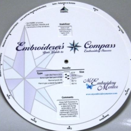 Embroidery Compass makes placement and stabilizing easy. This unique tool will help all embroiderers choose the correct stabilizer, topping, needle and technique for any project. Just dial the pointer to the type of fabric to be embroidered and the chart give you suggestions for each step of the embroidery process. Click here for a quick video on how the compass works.