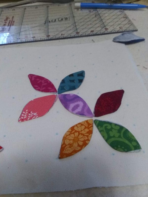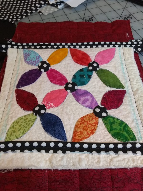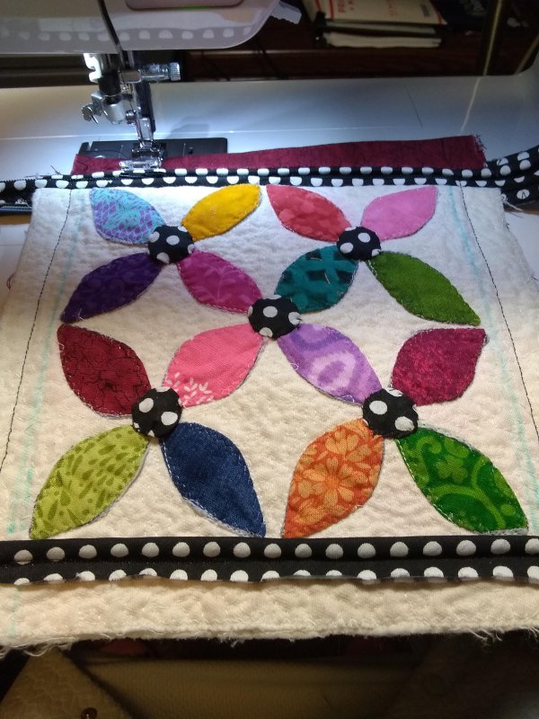 The “Piecemaker”, “Scrappy Quilter” and “Sew Fly” Lap Quilt group is tackling the “Orange Peel Purse” called “Mini-Peel Cross Body Bag” by Becky McDaniel on Esty. The 3 groups will be breaking the construction of the purse down to more simplified lessons and the process will be spaced over the next few months. We will be discovering the orange peel applique design, piping, zipper insertion, channel quilting and more as we make the purse. I hope everyone will have a great addition to their wardrobe when they are through constructing the over the shoulder bag. I made my bag from the scraps and supplies in my stash. Below are pictures of my construction progress.