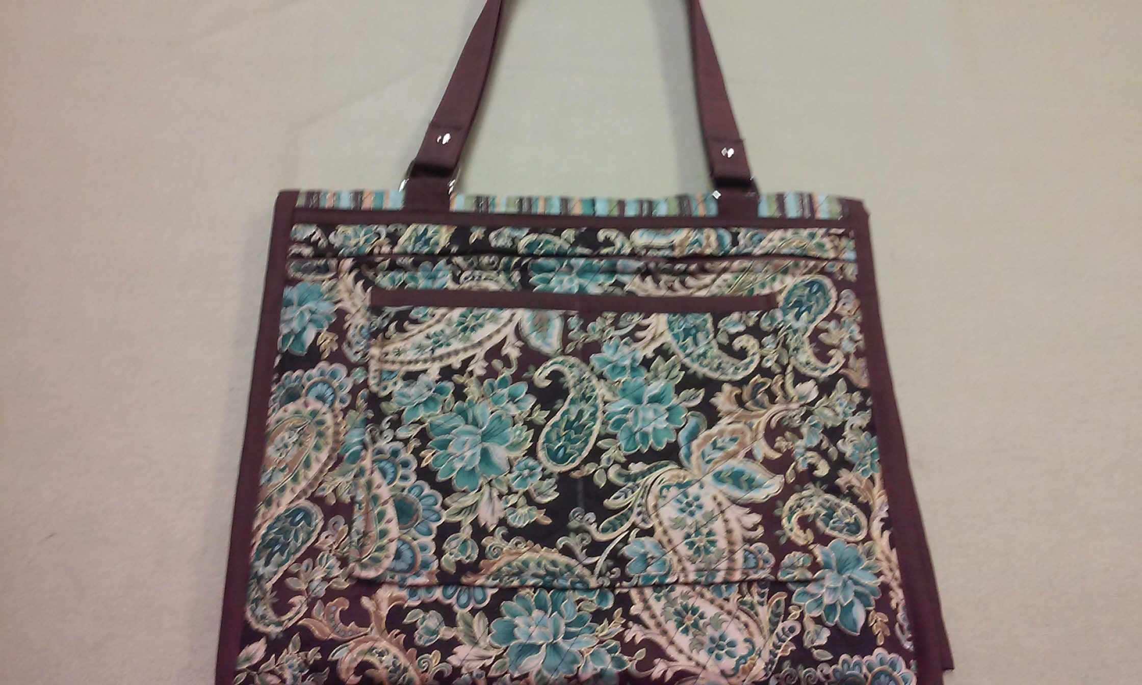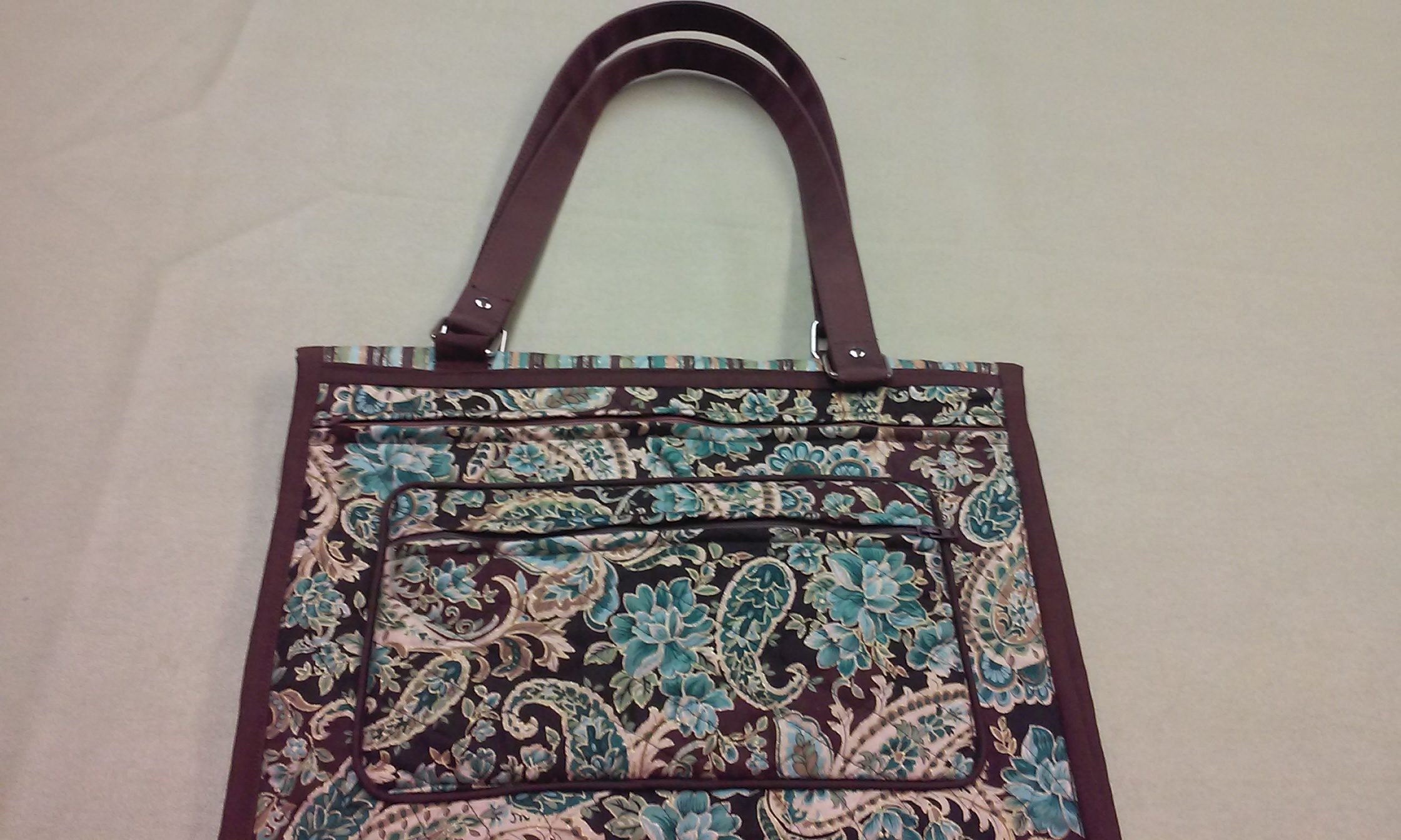 Here is a great purse for someone who needs to carry a lot of items and needs some way to organize them. The purse is formed by cutting a 1 1/2 yard double faced quilted fabric approximately 14″ wide by 54″. The deep bound side pocket were formed by folding the ends to the center to form pockets about 14″ deep. Size can vary. Invent side pockets with zippers as I did or try patch pockets. These photos are sewing ideas and construction options. Create your own purse. To finish this style you will need side straps or ties to hold the 2 folded sides together. You can let the pockets expand when you stuff the purse with tablets, phones, credit cards, coupons, medical information, tissues and more. You will also need a handle. Invent and have fun.
