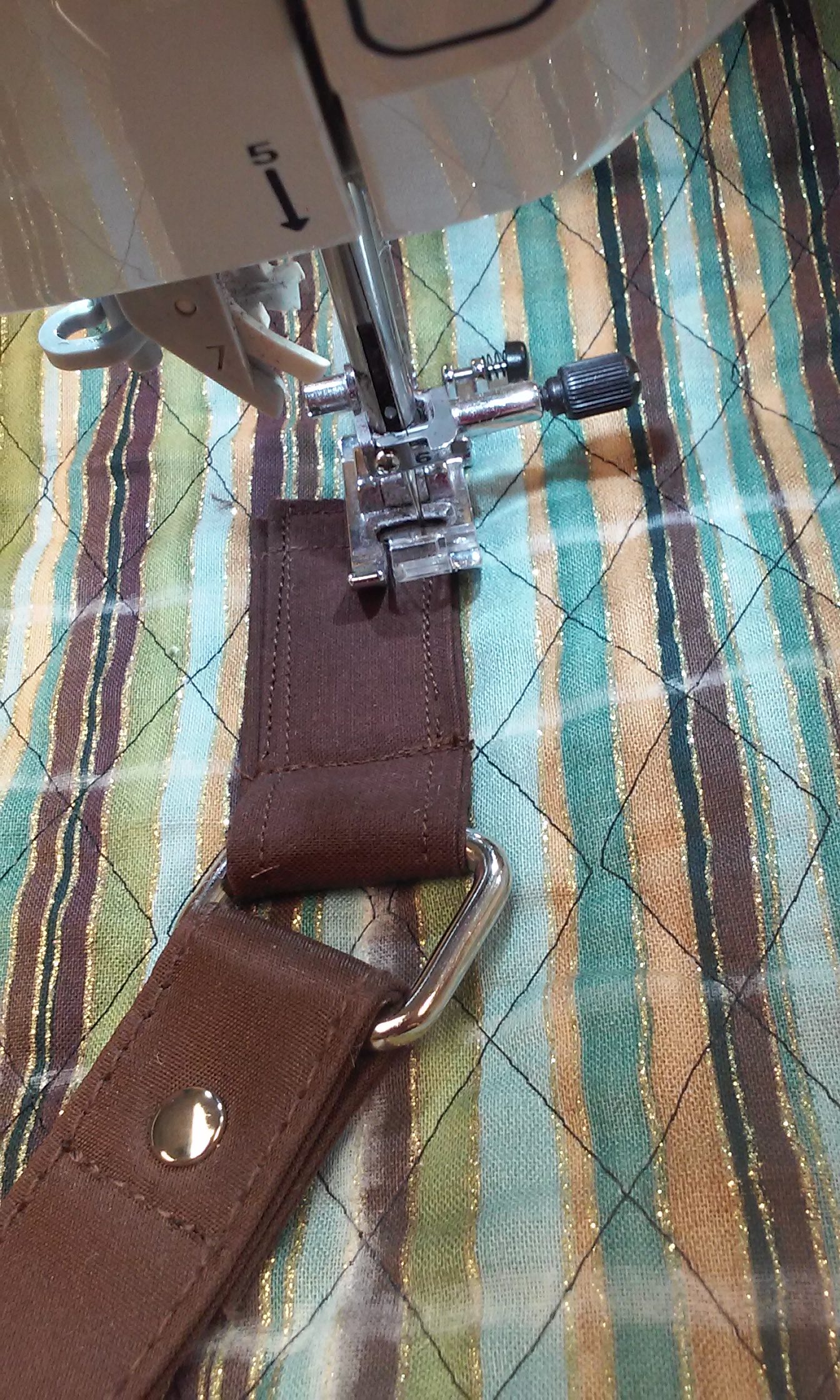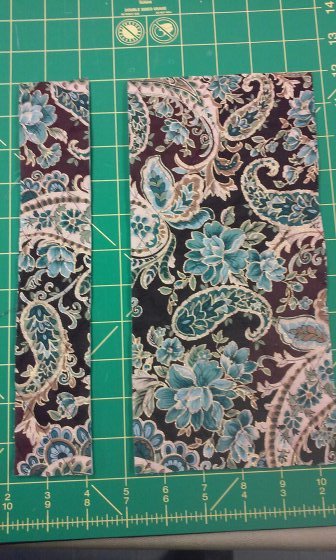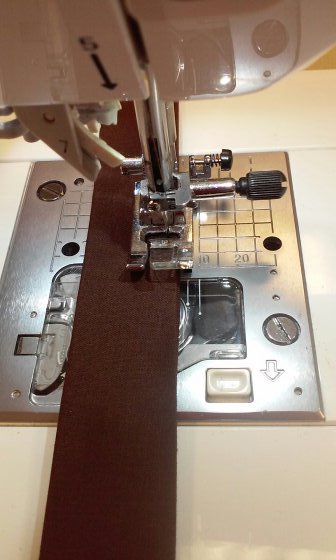 Using a 4″ strip, press both raw edges to the center and then fold in half and top stitch to form the strap