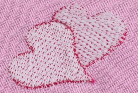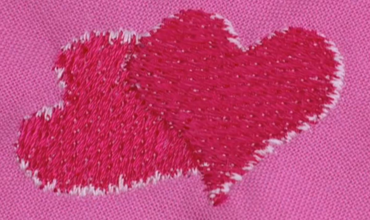 Misthread ! The white showing on the top side of this heart embroidery is an indication the bobbin case is not threaded properly.