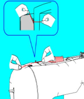 to thread using both hands to pull the thread into the top tension. Not seating the thread into the top thread tension can cause jamming and thread loops on the bottom side of the work. If you do not stop the machine in time after a thread jam you can cause bobbin case and needle plate damage. This will cause endless frustration. The only way to fix this problem is to pull the bobbin case out and examine it for needle picks. File the picks to smooth them and replace the bobbin case at the first chance you get.