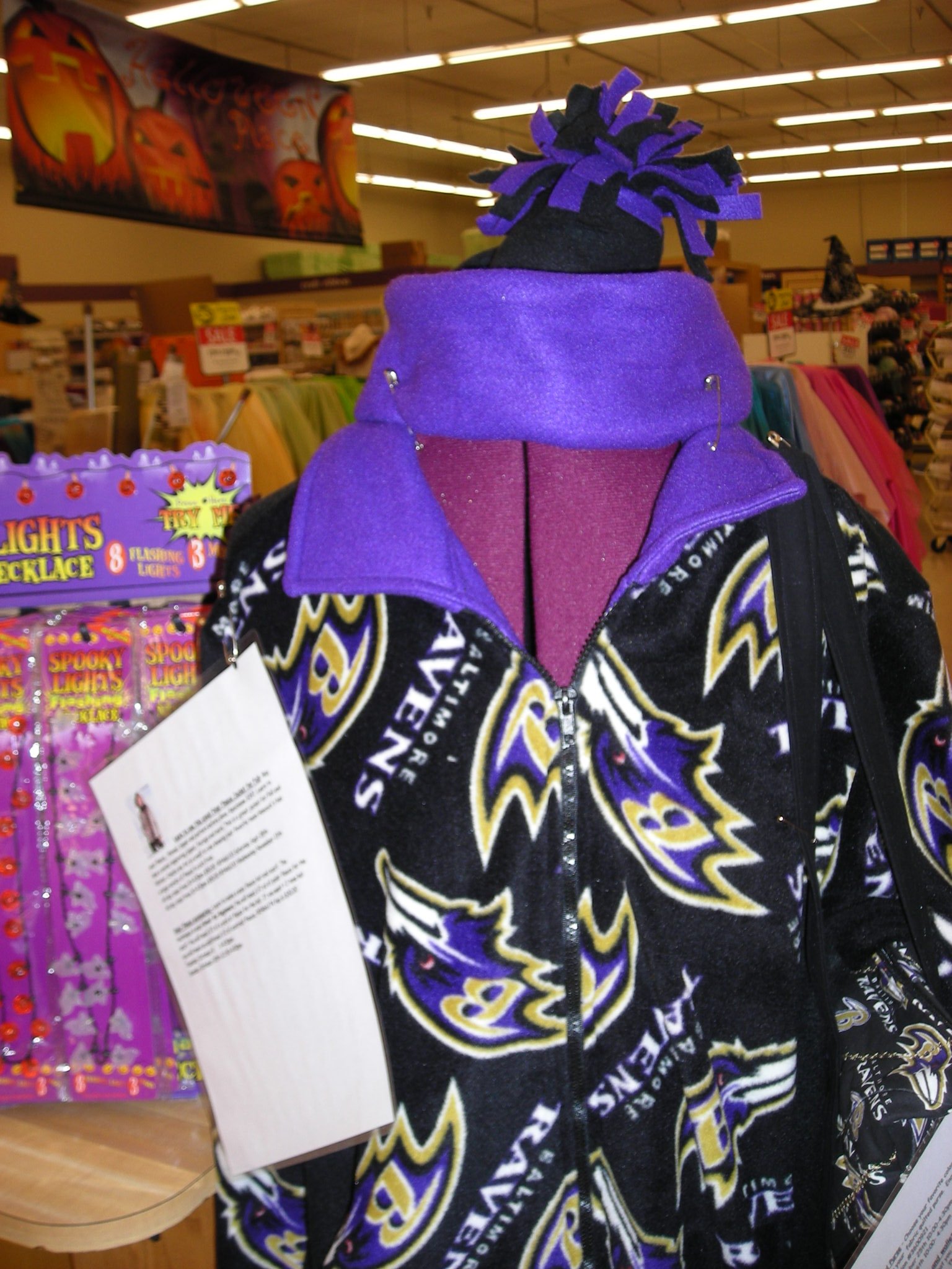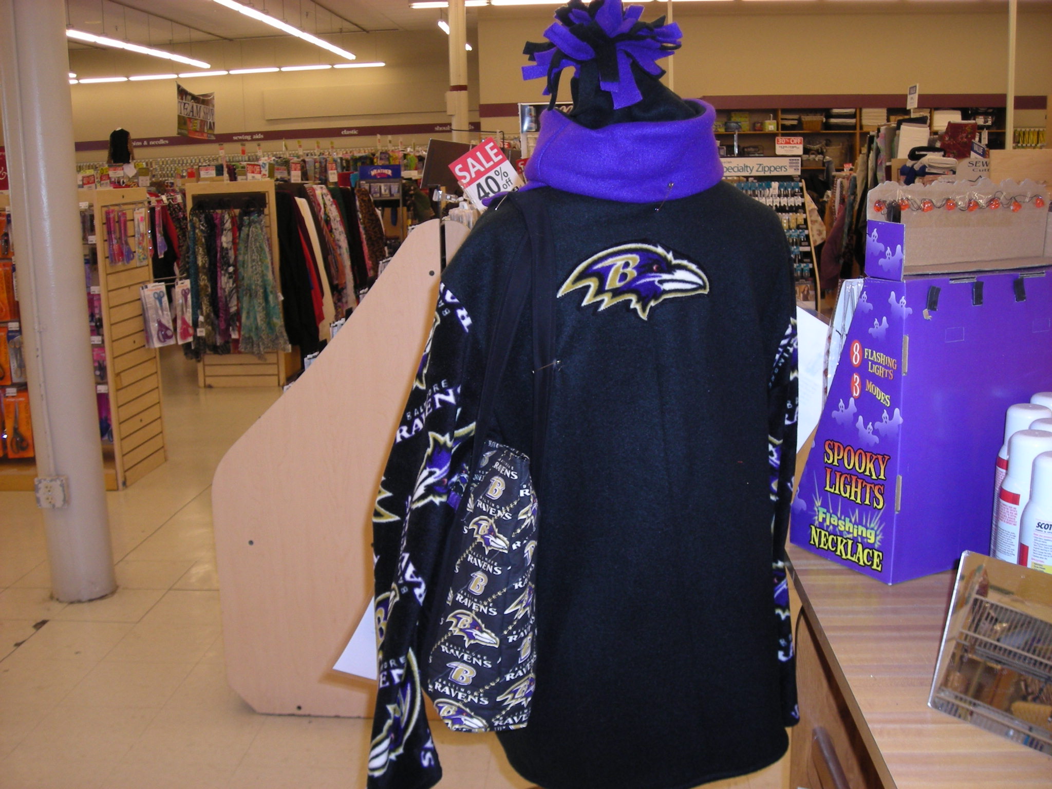 Are you a football fan? Our team is the Ravens. Hancock Fabrics carries team polar fleece and prints. Learn to sew Polar Fleece and make a team jacket in our all day class at Hancock Fabrics. Make a hat and scarf accessory in a 3 hour class. Learn to Quilt the team fabric to create a matching purse . I have a class for the quilted fabric purse too.