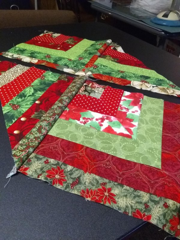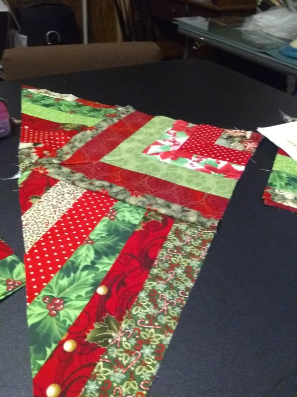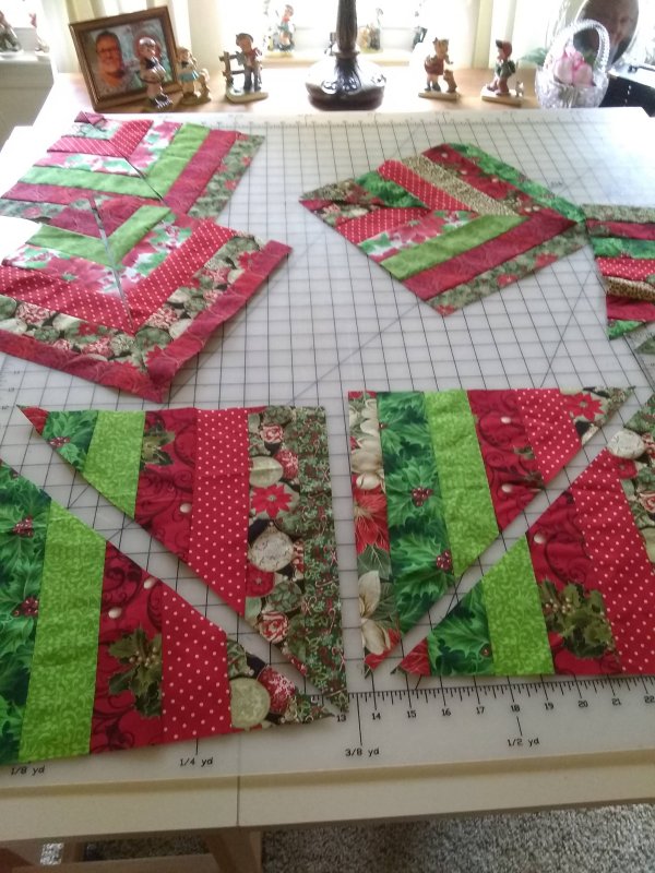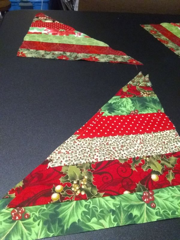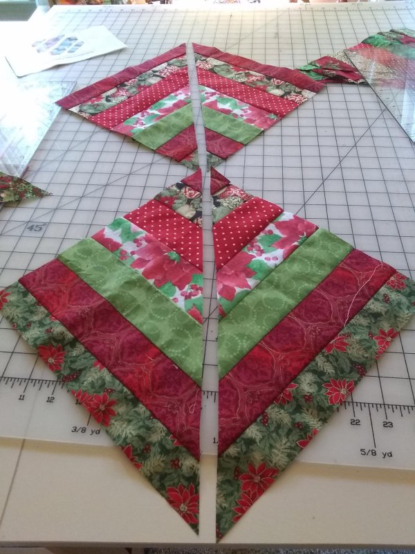 I used my 12″ square ( or 12 1/2″ square as a template) to cut 3 squares across the 45″ width of the pieced strip. Next I cut groups of triangles. Once the triangles were cut, I laid out the runner. Given the scope of this table runner and the demand for the class I will probably only be able to accommodate 3 students per session so students have a place to layout and sew the runner. If you want to be a part of this project please let me know now if you plan to attend.
