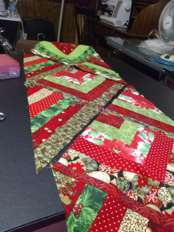 I finally decided to line and turn my finished runner. Then I will do some basic quilting to hold it in place. I am using a scrap of single faced quilting for my lining.