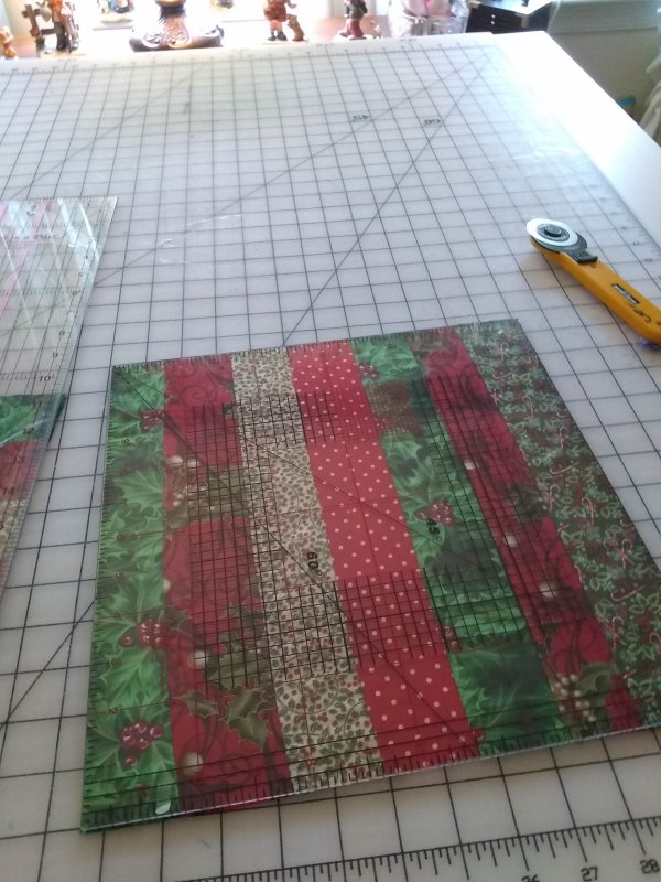For the lap quilt club project Saturday October 16th we will will do a strip pieced table runner. I used all my scrap 2 1/2 ” Christmas strip fabrics to create a colorful project. I am giving my club members a head start on preparing for the October project. Start by gathering a least 7, if not more Christmas fabrics. I used about 14 different prints. You will need at least 1/4 yard of each fabric. You can then cut the