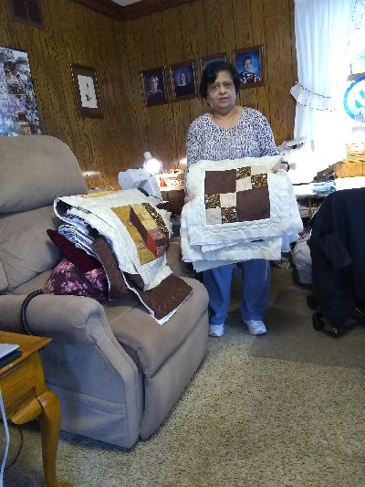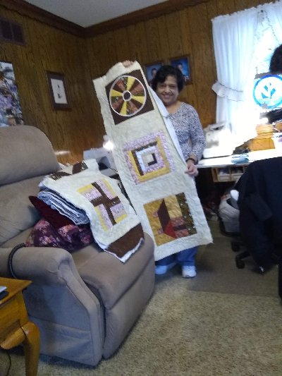 The first thing we did was admire all the work that Sashi has put into her king size Lap Quilt. She has 36 blocks done and is in the process of assembling the quilt. I have also included a picture of Jane’s quilt in assembly stage. Here are pictures of the quilters Jennifer, Sashi, Diane, and Jane at our January 2nd 2020 meeting.