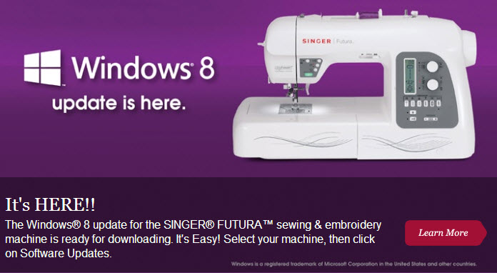 Recently Singer has annouced a Windows 8 update to the XL Futura software! The windows 8 update has downloadable instructions I advise you to follow. The update will work on the XL-550, XL-400, SEQS-6700, SEQS-6000, and the Quartet (FQ-4) I have recently purchased a new Windows 8 computer and am planning to take a local community college course on the operation of the new windows system. I am getting the hang of the system but my navigation skills are poor on Windows 8 after 19 years of using the computer. I love skype, working on Windows live mail ( prefer my old outlook express), like being able to keep web addresses bookmarked by windows but am having a hard time finding my address book.Jenny